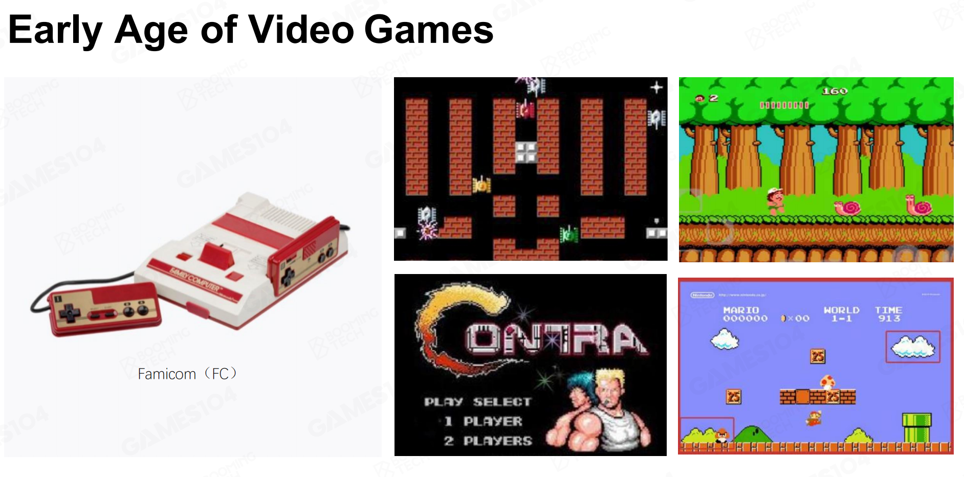 视频游戏行业的历史也不过短短的五十多年左右,早期的游戏多为在红白机上运行的视频游戏,此时根本没有Game Engine这个概念,游戏都十分的简单,大家所想的是如何将复杂的元素放在很小的存储空间内。比如马里奥中,将云彩的贴图换个颜色放在地板上就变成了草丛,将小乌龟的正面反面来回播放就形成了走的效果,此时是游戏的黄金时期,大家关注点在于游戏性和趣味性,在此时期诞生了各种经典的游戏,《魂斗罗》、《马里奥》,《坦克大战》等知名IP。