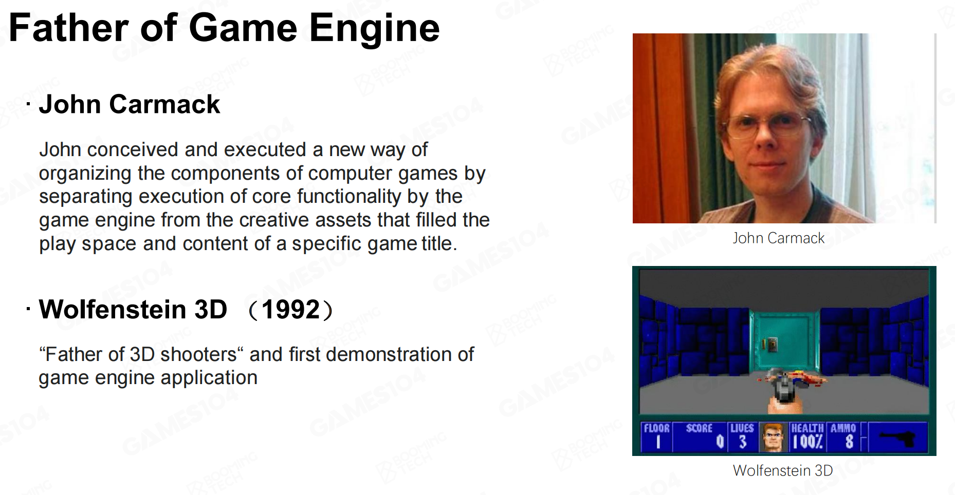 游戏引擎之父John Carmack,将他参与研发的一款FPS游戏《德军总部3D》中能够复用的核心功能分离出来,便产生了早期游戏引擎的雏形。在他后来开发的第二款游戏《Doom》中,他将其中分离的功能卖出,便有另外一款游戏《Shadow Caster》被开发出来,这款游戏在商业上取得了巨大的成功,此时距离真正的游戏引擎的诞生已经很接近了。直到《Quake》的问世,其中的核心分离出来制作的Quake Engine,被用来制作其他第一人称射击游戏,至此,第一个游戏引擎诞生了。