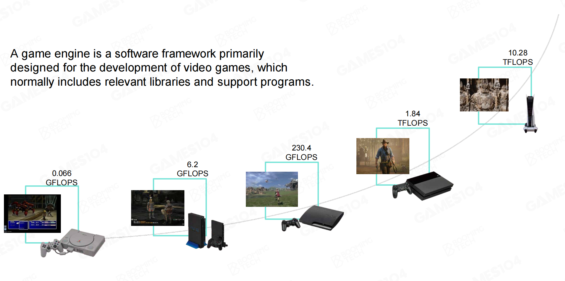 最早的计算机硬件中并没有显卡,直到人们认识到逻辑运算和图形运算并不相同,图形运算是大量向量运算,而且有大量的并行化运算,并不适合用CPU来运算,此时,显卡便诞生了。硬件的发展不断推动着游戏引擎的发展,随着显卡等硬件性能的不断提升,游戏引擎的算力也从Play Station 1到Play Station 5提升了约二十万倍,游戏的质量自然也随之得到快速提升。更高的算力也就意味着游戏引擎变得更加庞大,复杂,也就演变成了现代游戏引擎。