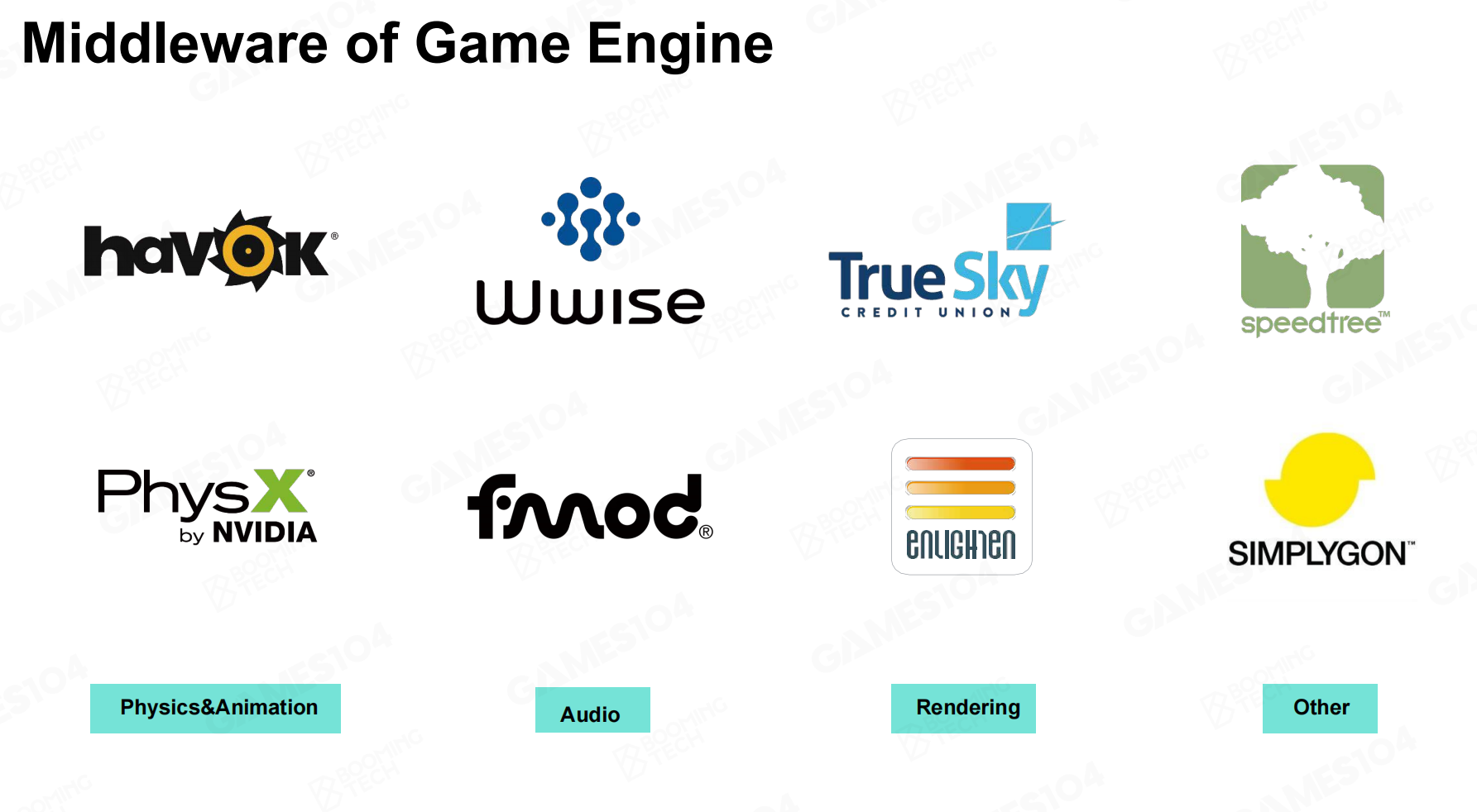 随着游戏行业的不断发展,诸如物理运算一类的东西会非常复杂,早期游戏会自己实现结算器,物理碰撞的检测等,但计算越来越复杂时,便出现了专门处理物理运算的模块,也就是中间件。中间件包含处理物理运算,声音效果等等的一系列引擎。