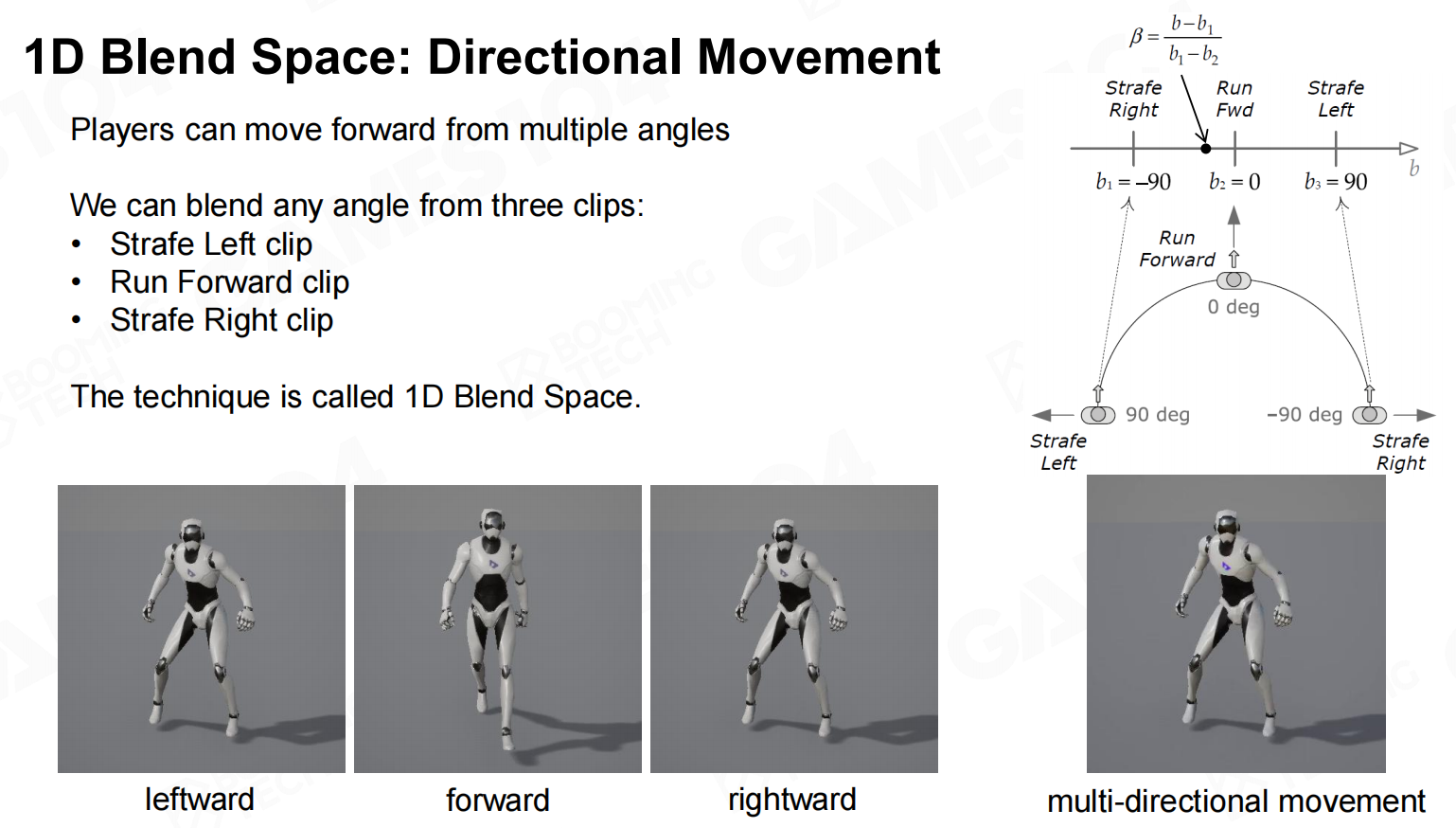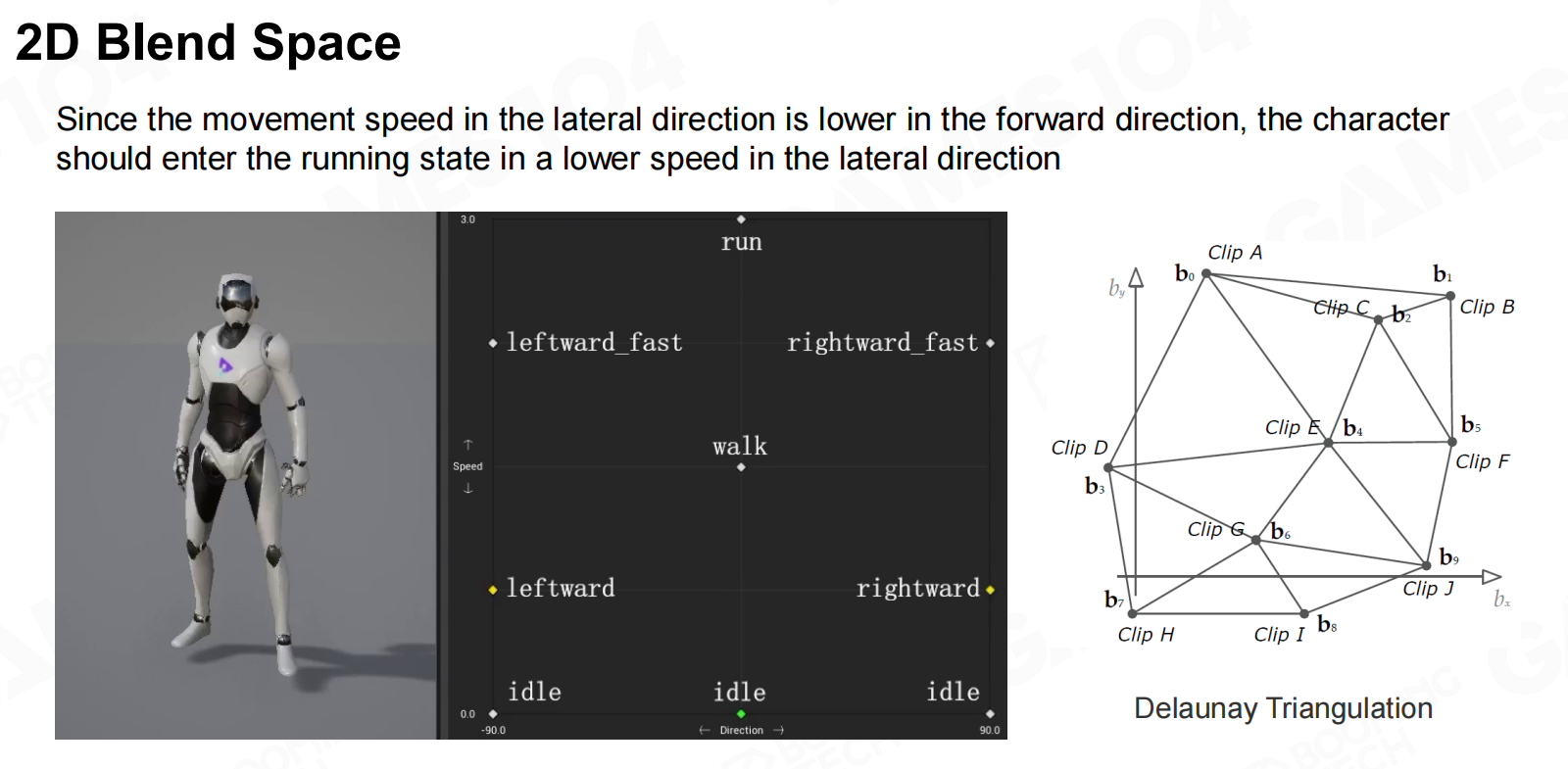 事实上当我们去插值动画的时候,并不局限于在两个clip中插值,也可以在多个动画clip中插值(比如直走、想左走以及向右走),