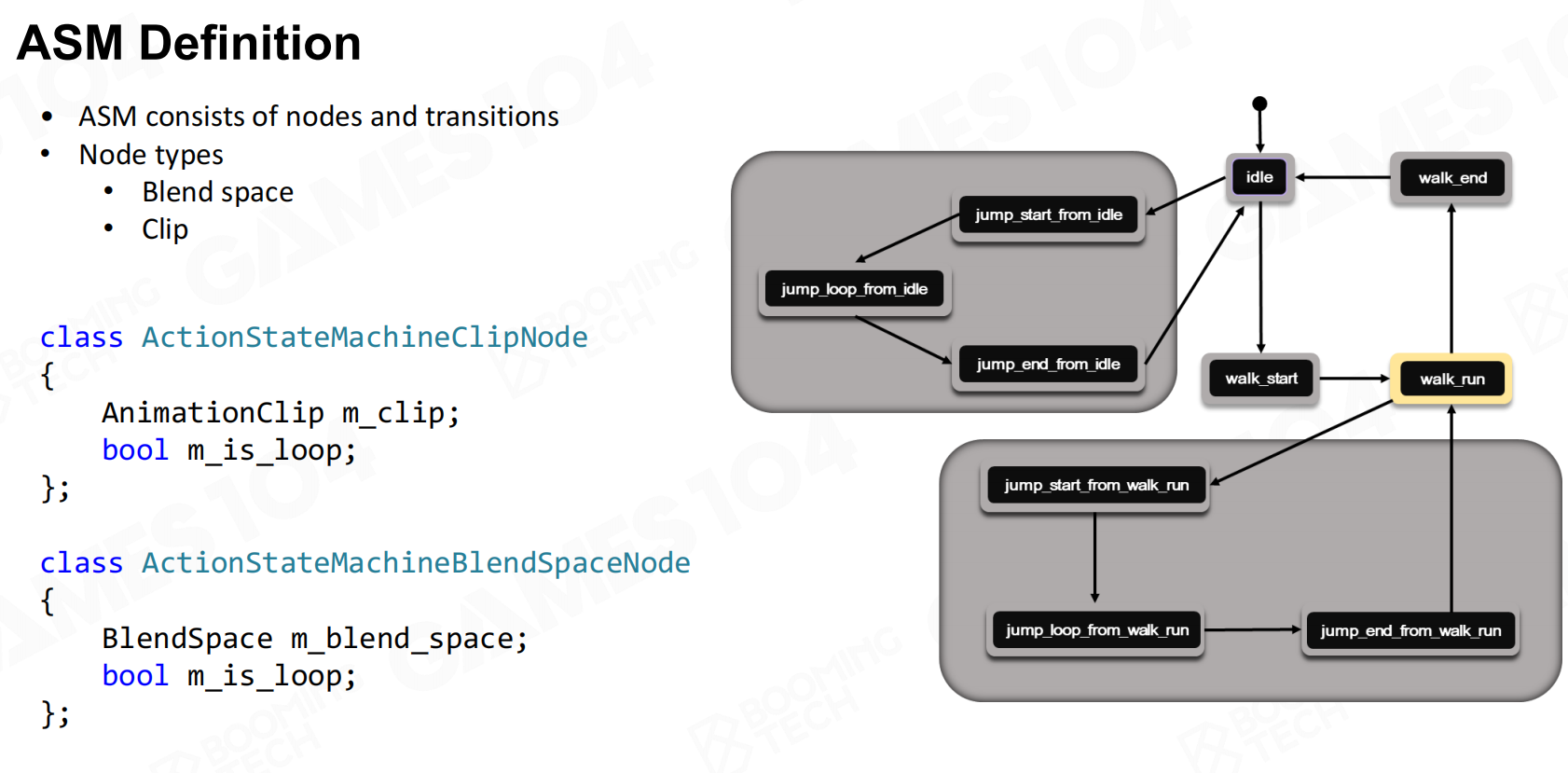 举个例子:当人物进行跳这个动作时,相关的这个ASM就会被调用进入起跳状态,然后根据具体的判断标准,