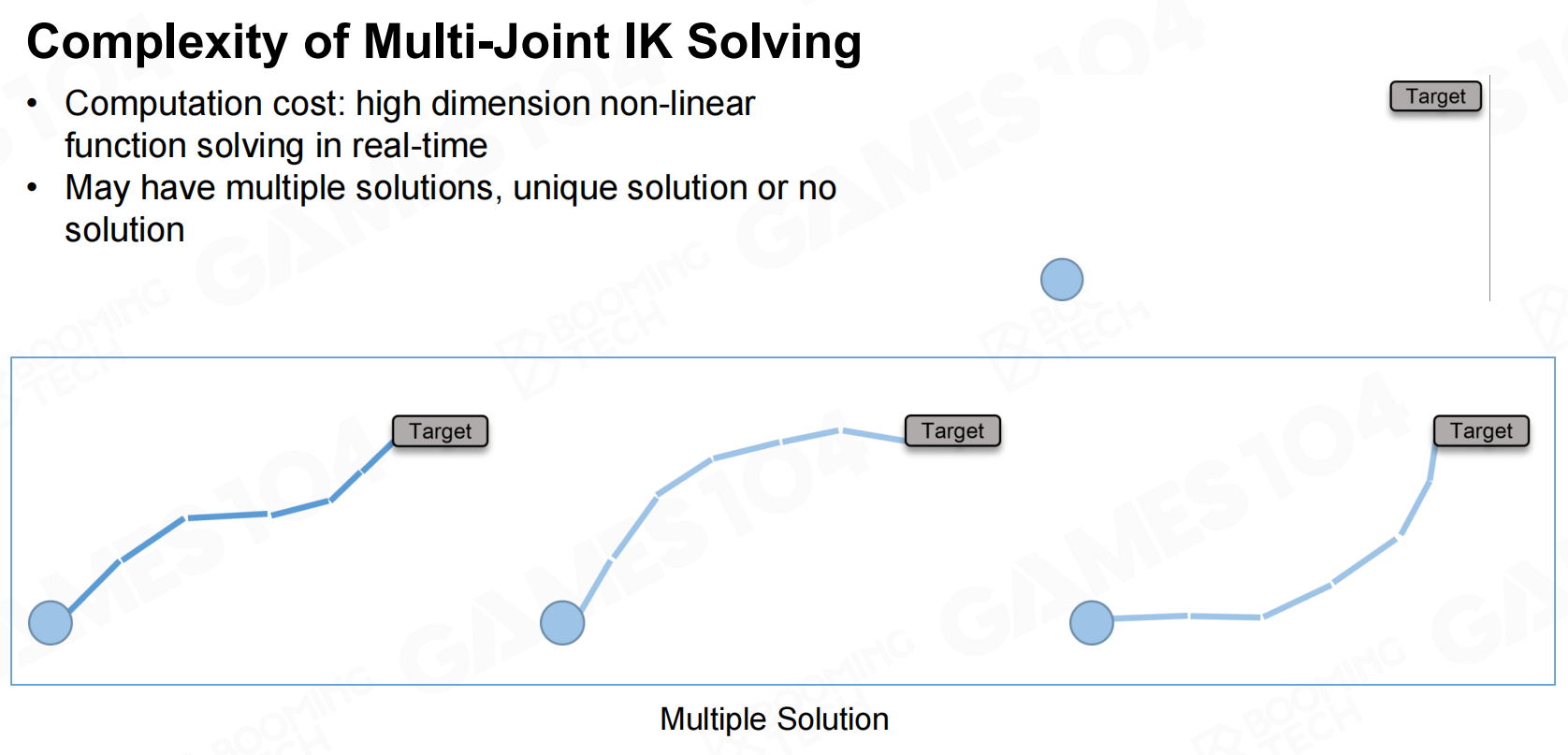 当有多条链的IK处理情况就变得极其复杂,难点: