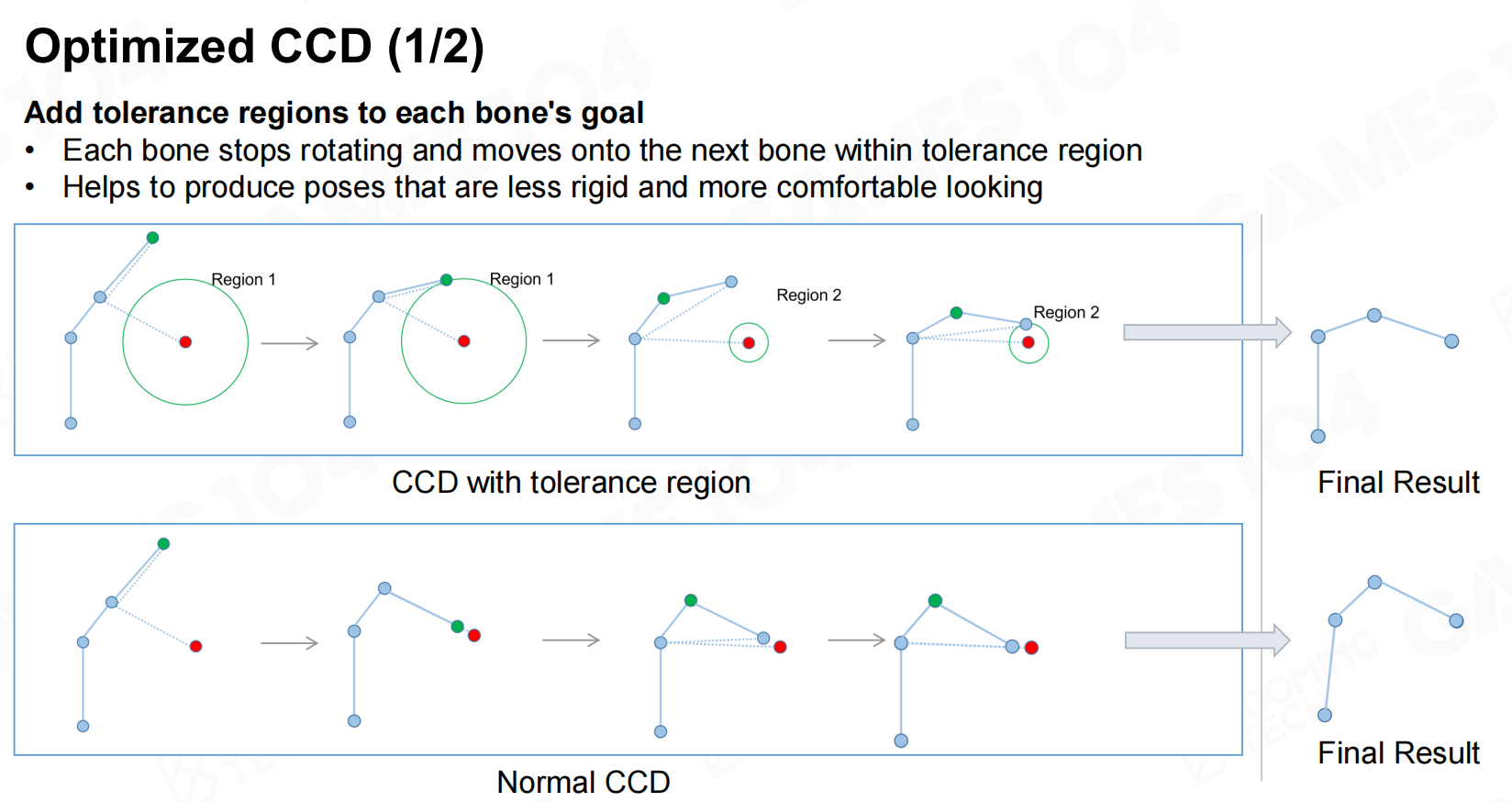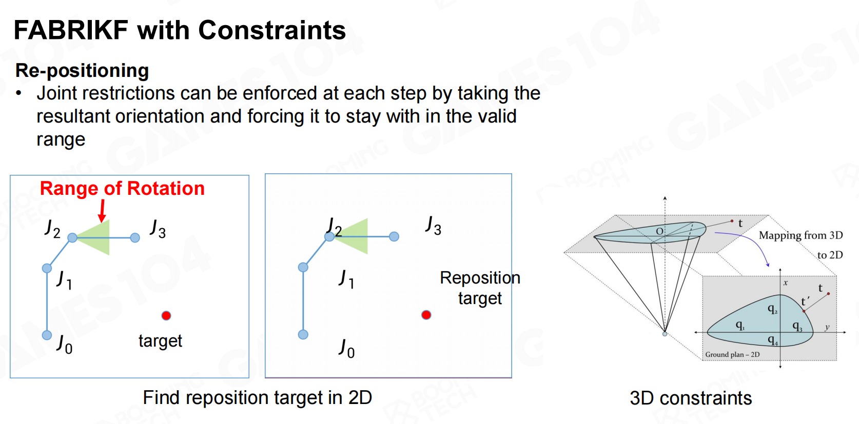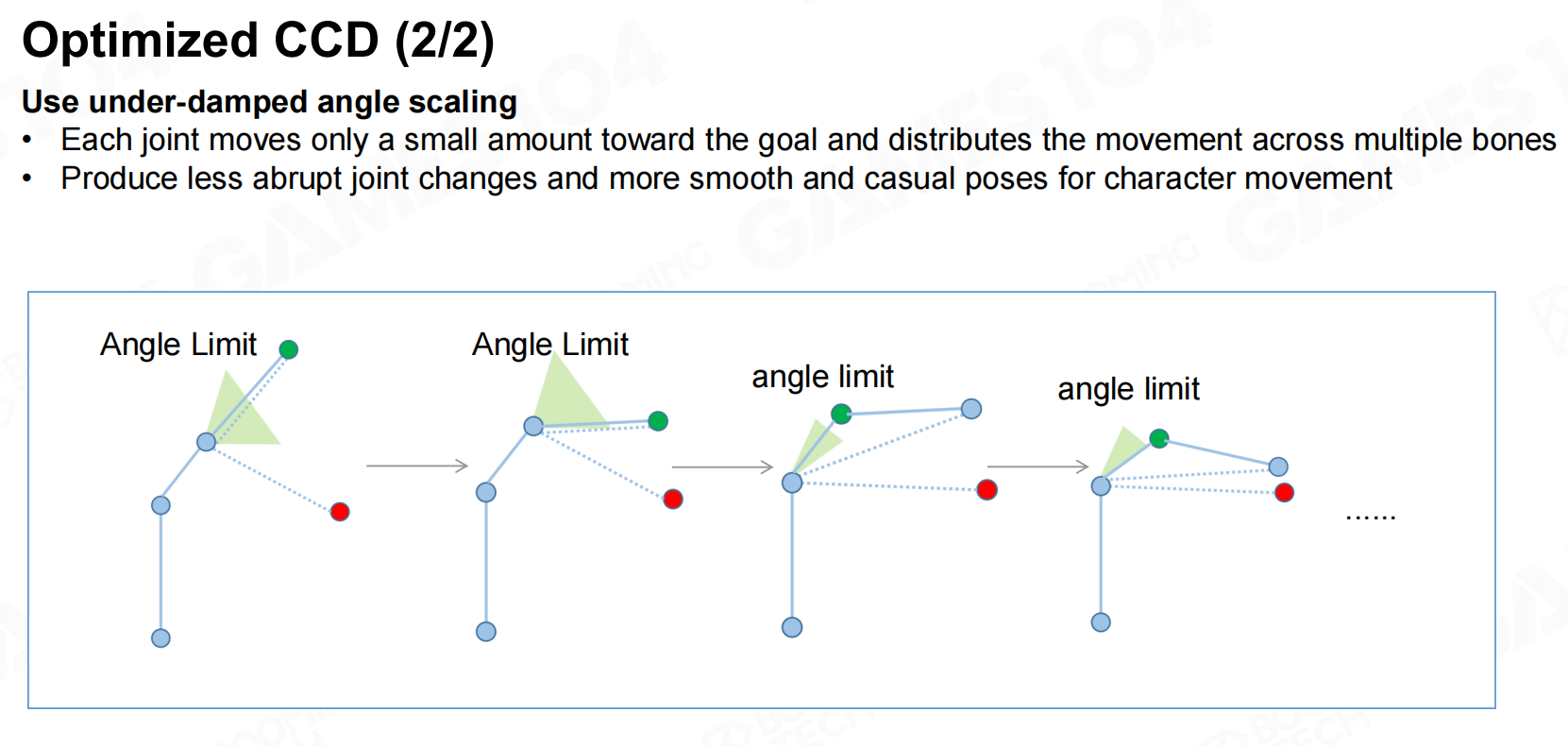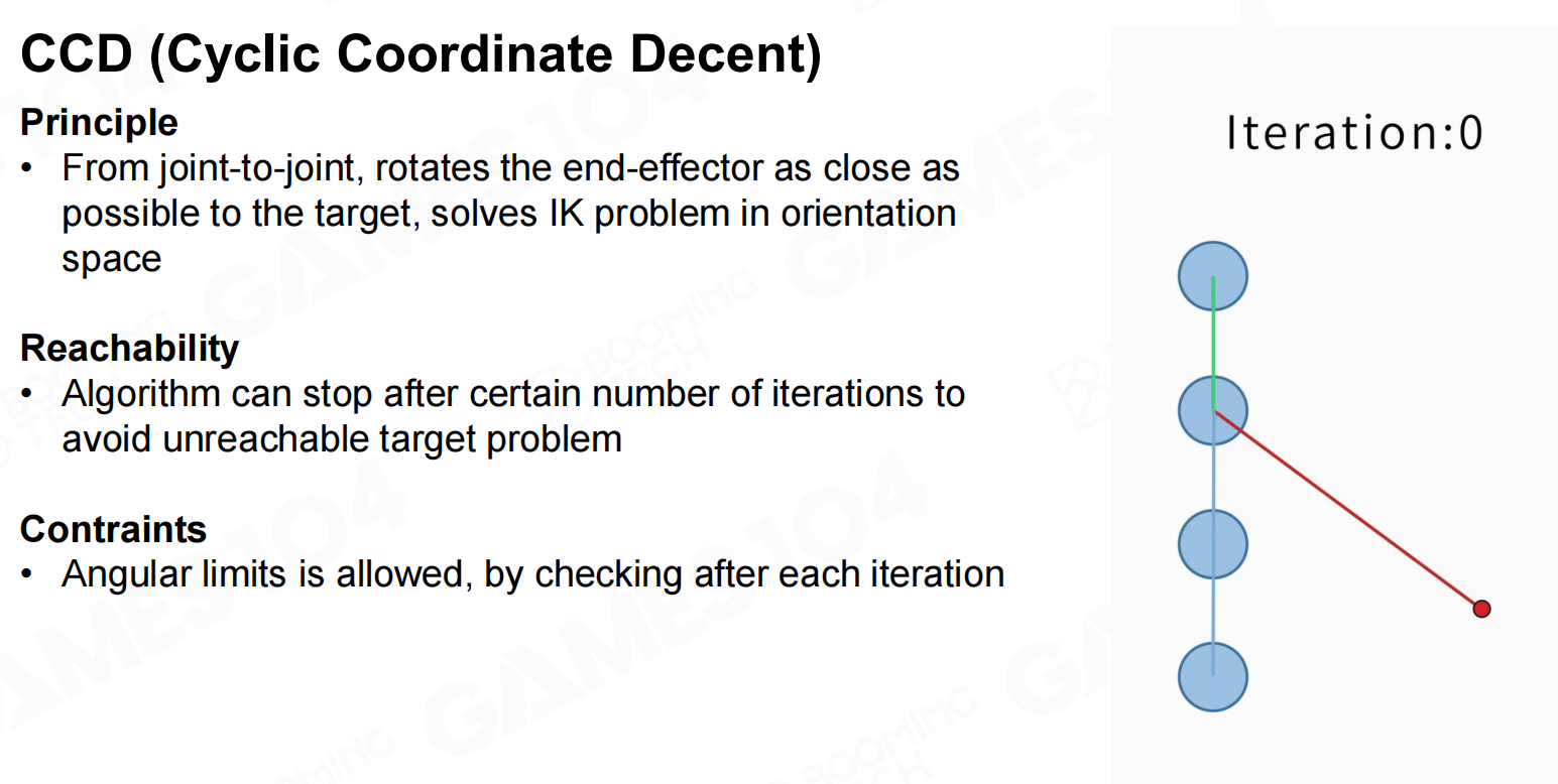 使得末端骨骼处于两者连线上。最后尝试将末端骨骼移动至指定位置。 - 终止:可设置一定迭代次数,无限迭代问题