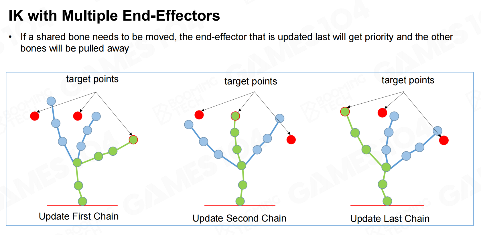 - 处理方式:为各链条设置优先级或者权重。(例如一个共享骨骼需要移动,最后更新的末端执行器将获得优先级,其他骨骼将被移除)