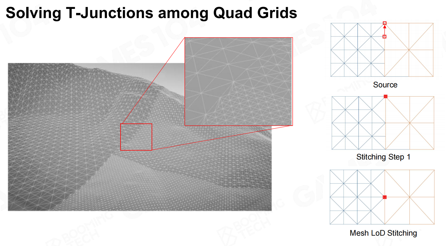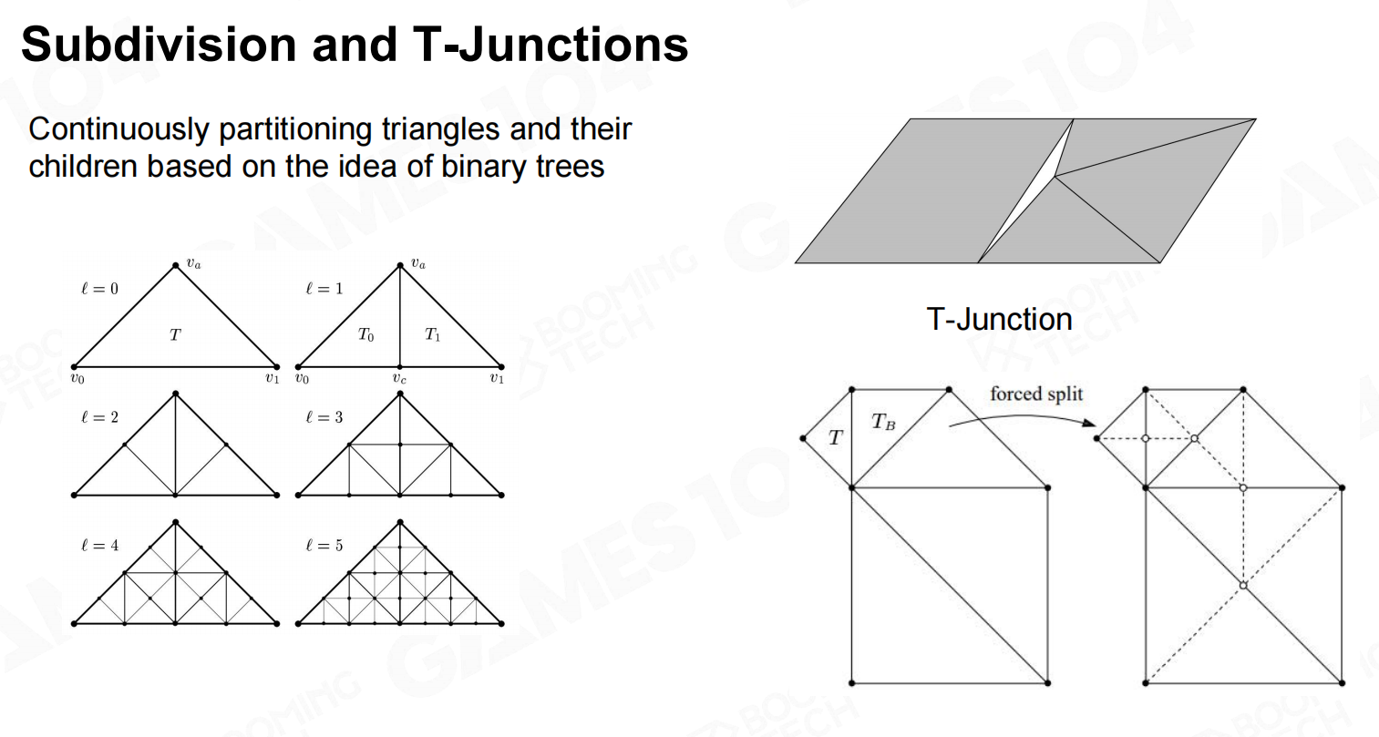但在处理时十分聪明:存在T-Junctions的问题三角形,将其新增的细分点吸附到临近三角形点。