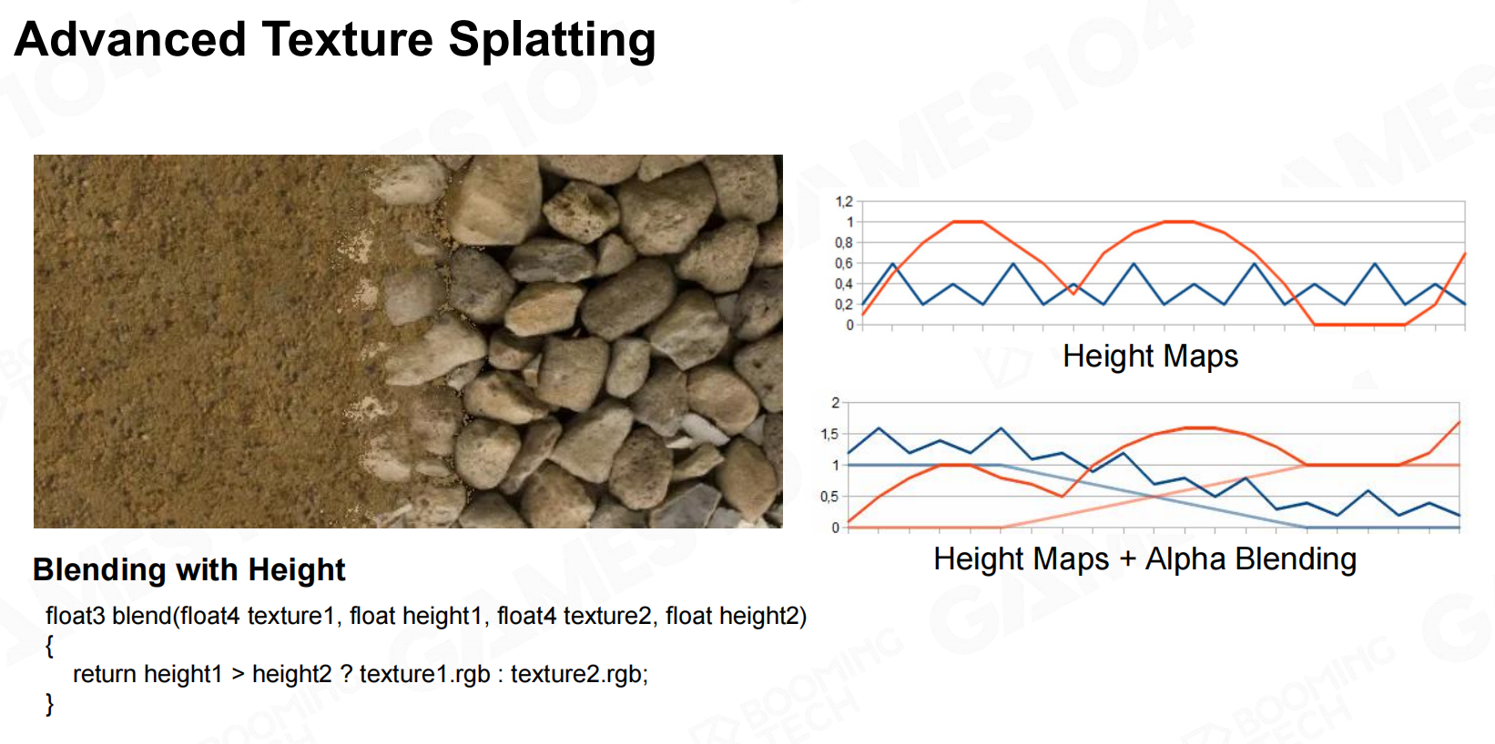 简单根据alpha的混合不符合现实:混合区域沙子应该更多得处于石头缝隙中,而不是线性得混合。