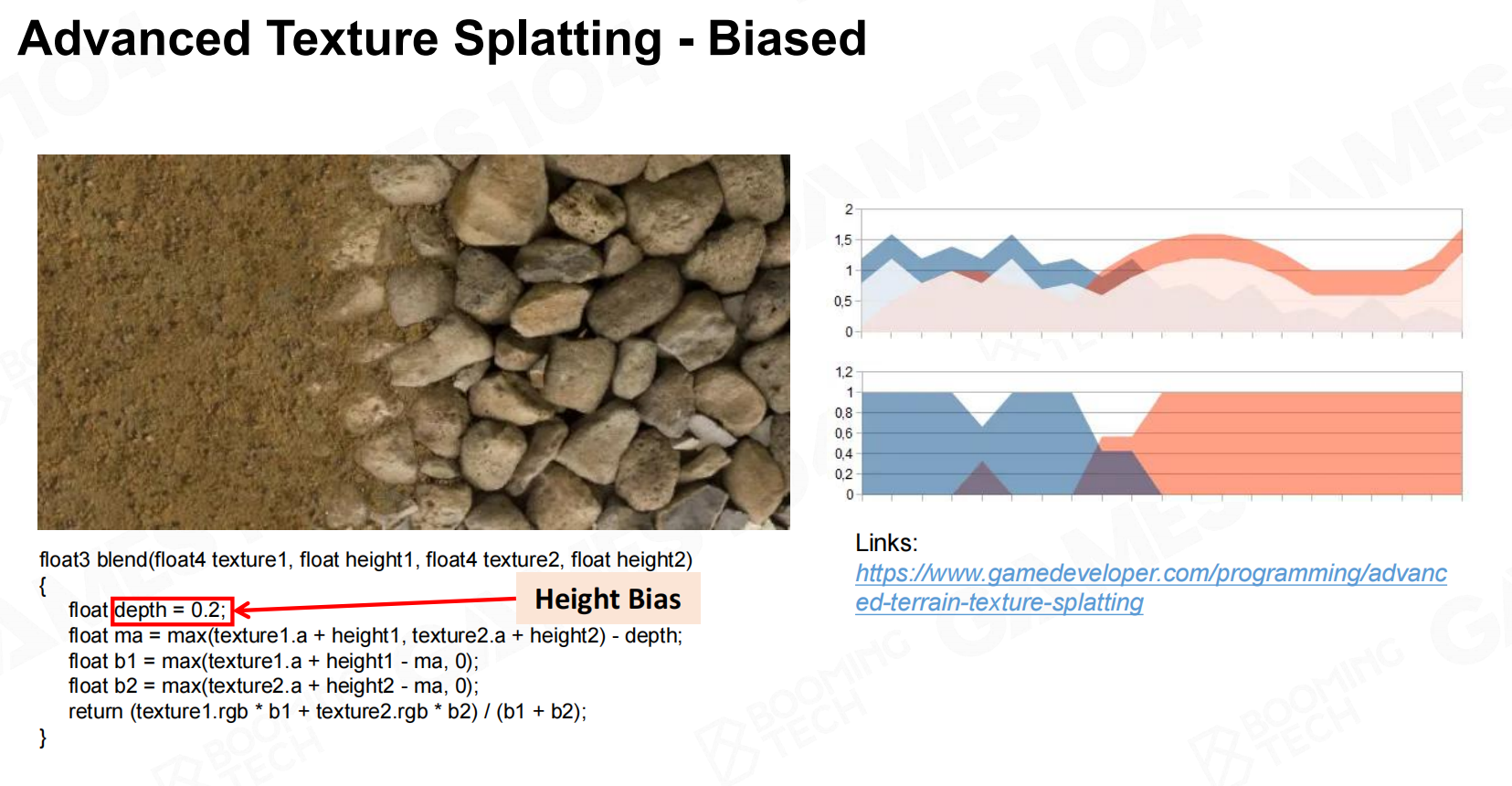 一种处理方式是对过渡区域做Height对比,从较高的区域区域过渡到较低的区域,则较高区域的混合权重下降慢一些,较低区域很快退去。