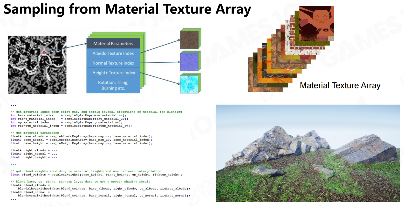 现代通常会用程序化的方式对地形物件进行生成,上面这些所有的纹理在渲染时,都直接Bake到VT中,减少渲染成本。