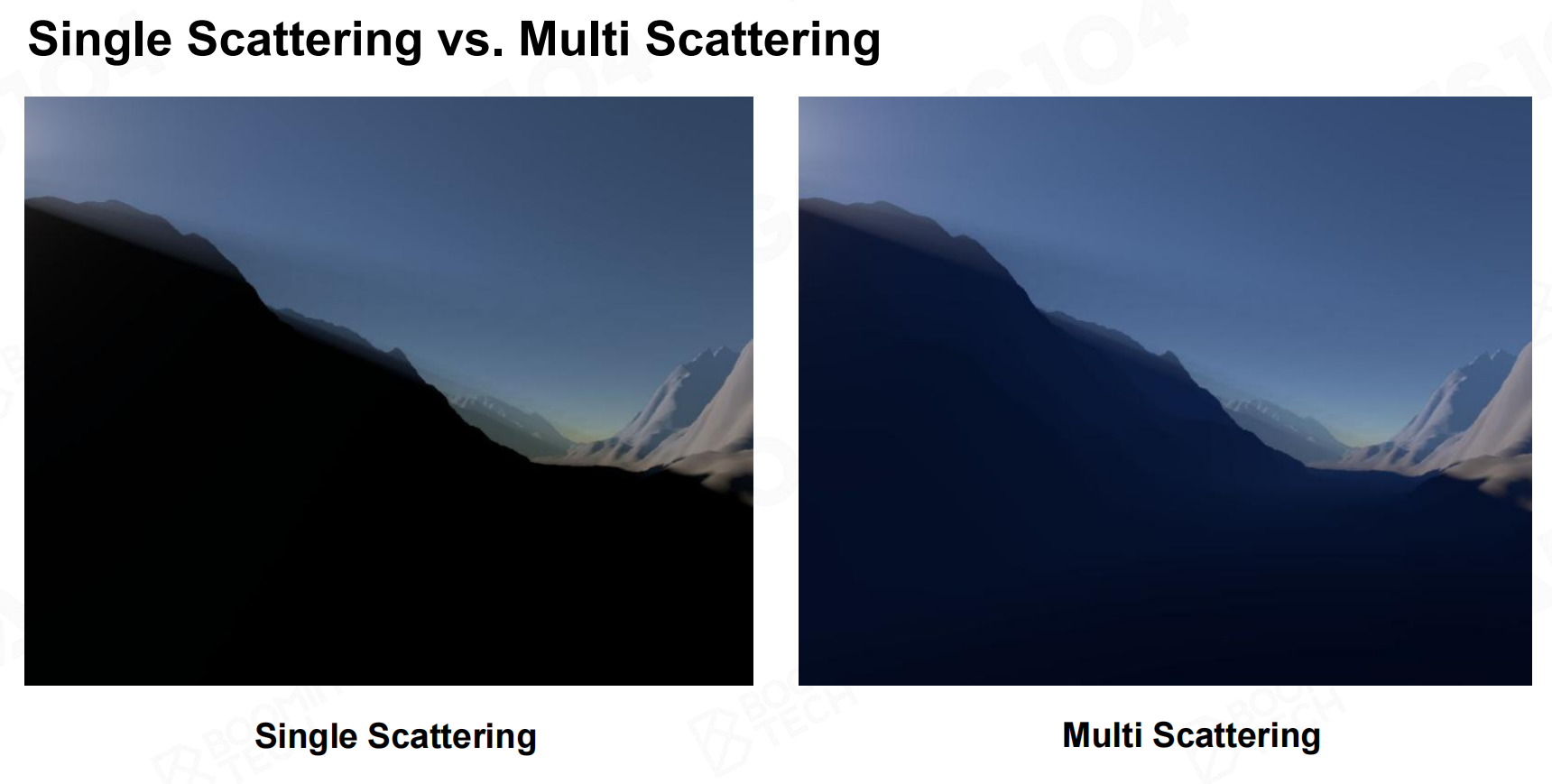 现实中气体散射会影响场景中的光照,上图中山的背面被空气的散射照亮。为了解决这一问题,我们可以使用Ray Matching的方式处理。