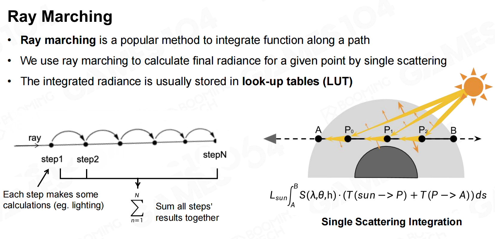 沿着射线的方向,均匀采样许多点。根据散射方程,计算散射积分。