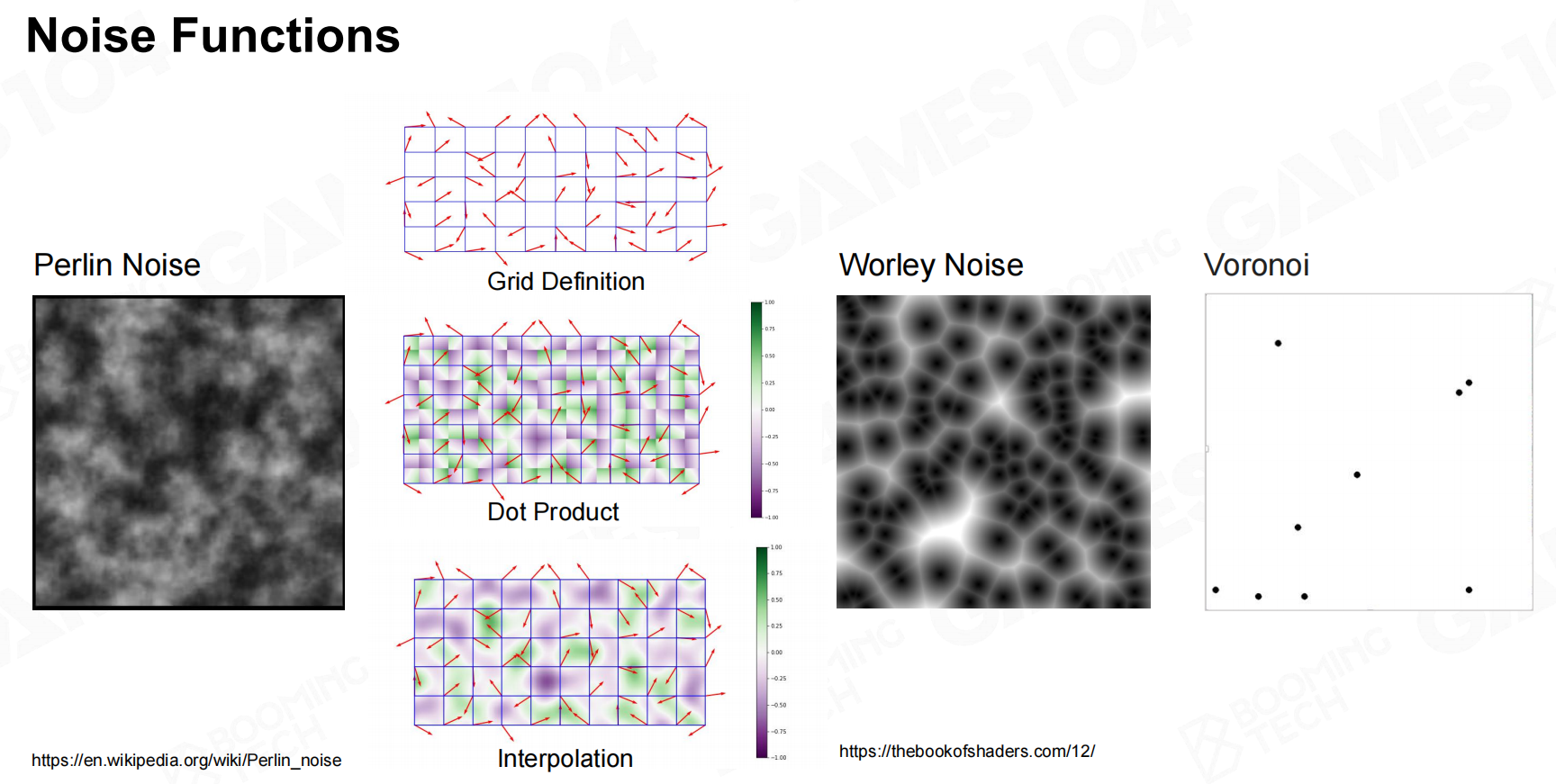 在项目中常见的随机扰动处理就是噪声。Perlin Noise可以生成的平滑的随机游走模型;Worley Noise模拟细胞的生成,根据空间中的点对空间进行划分。