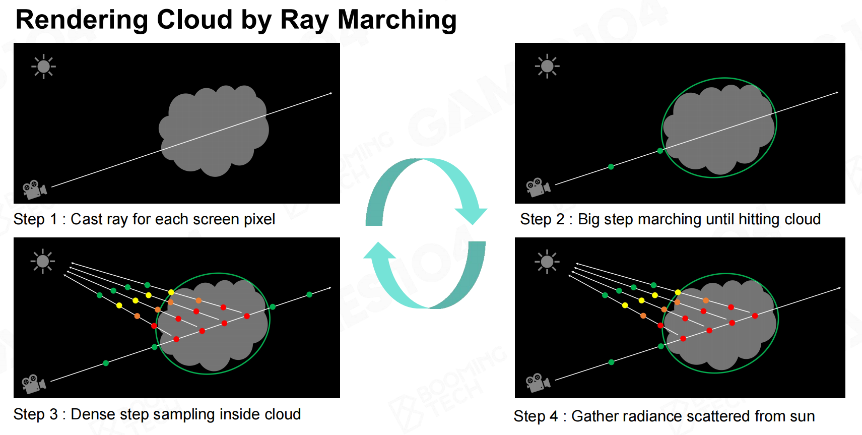 有了云模型之后,就要考虑如何渲染了,处理方式和大气类似:Ray Marching。由于云的通透度度很低,并不需要像大气的复杂处理,