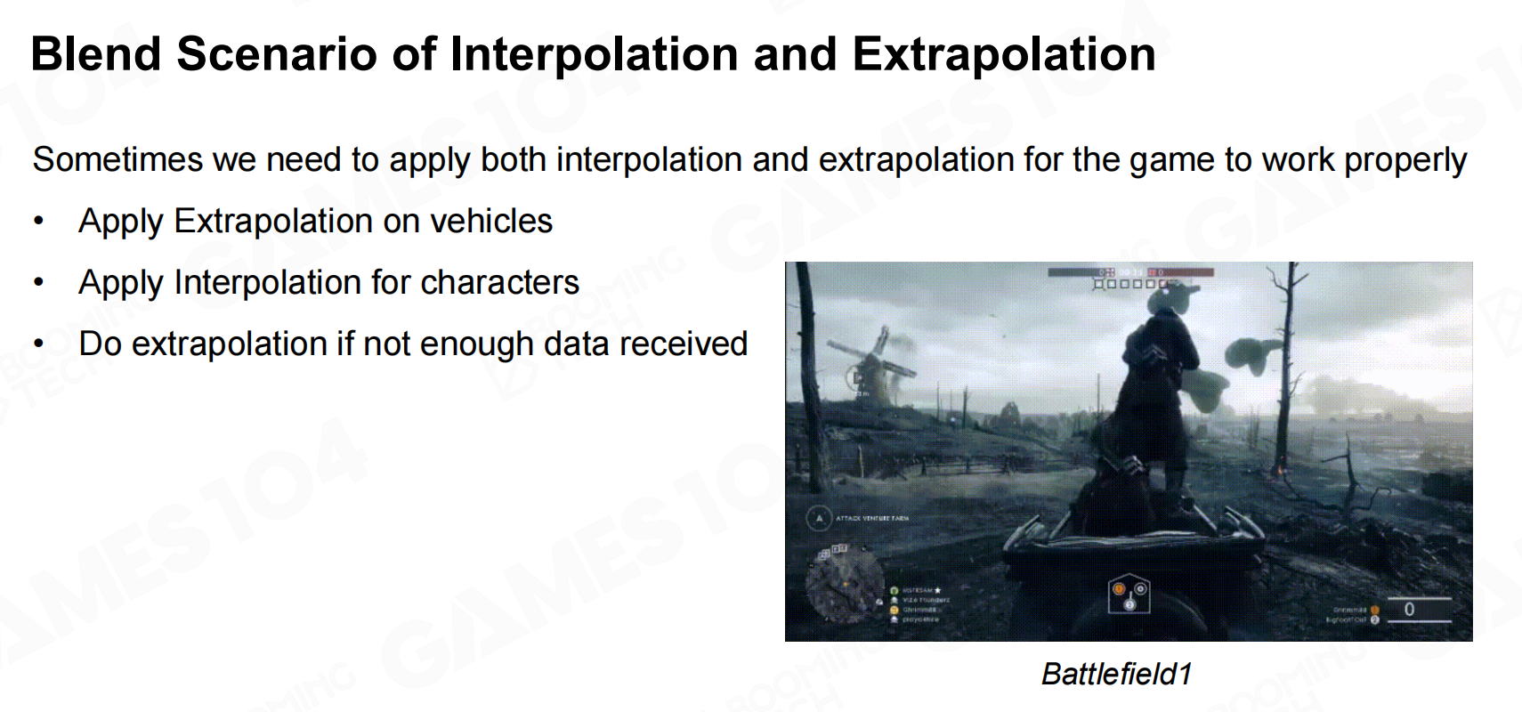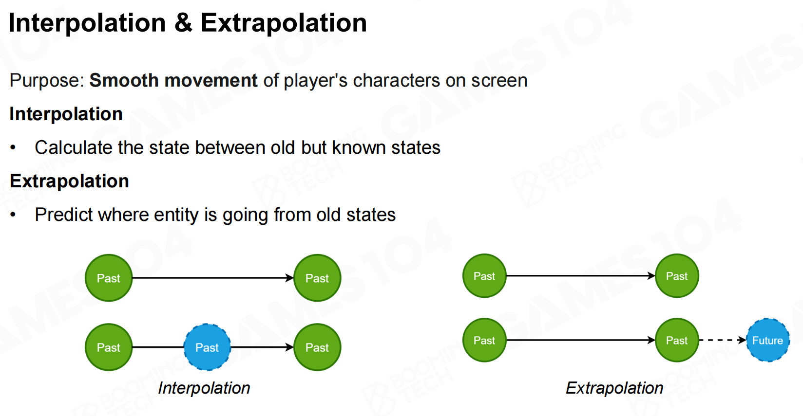 在这种情况下我们可以使用内插(interpolation)和外插(extrapolation)两种插值方法来缓解延迟。