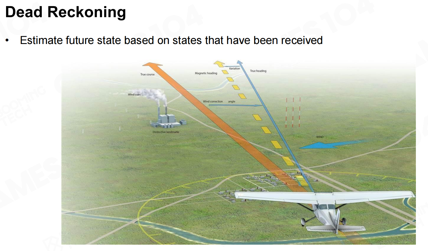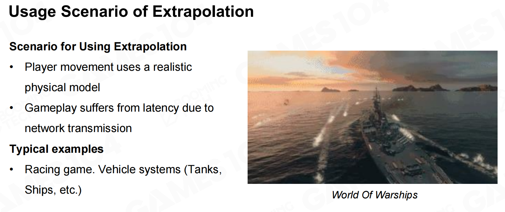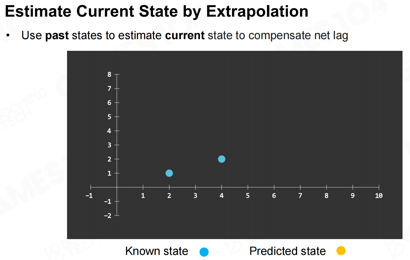 相比于内插,外插的本质是利用已有的信息来预测未来的状态。当我们对网络延迟有一定的估计时就可以通过外插的方法来推断角色的状态。
