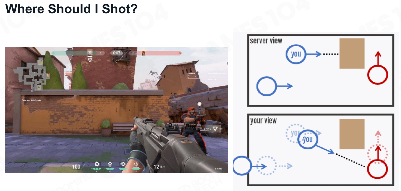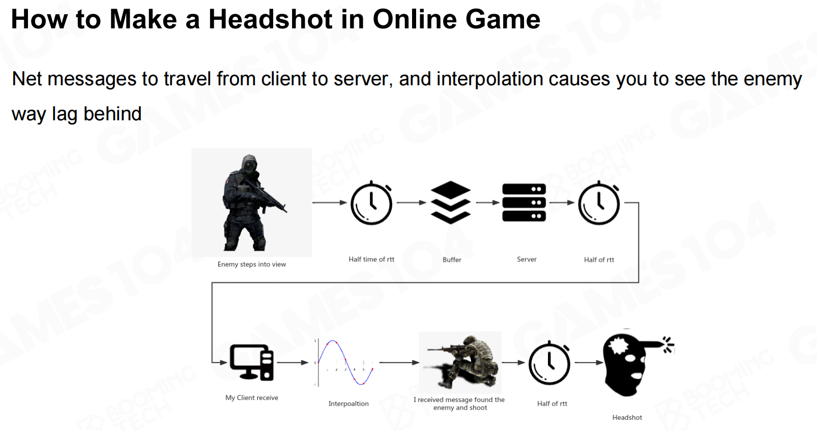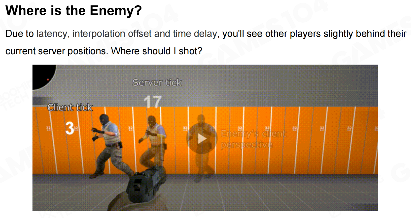 命中判定的难点之一在于确定敌人在什么位置。由于网络延迟和插值算法的存在,玩家视角下的目标是落后于服务器上目标的真实位置的。