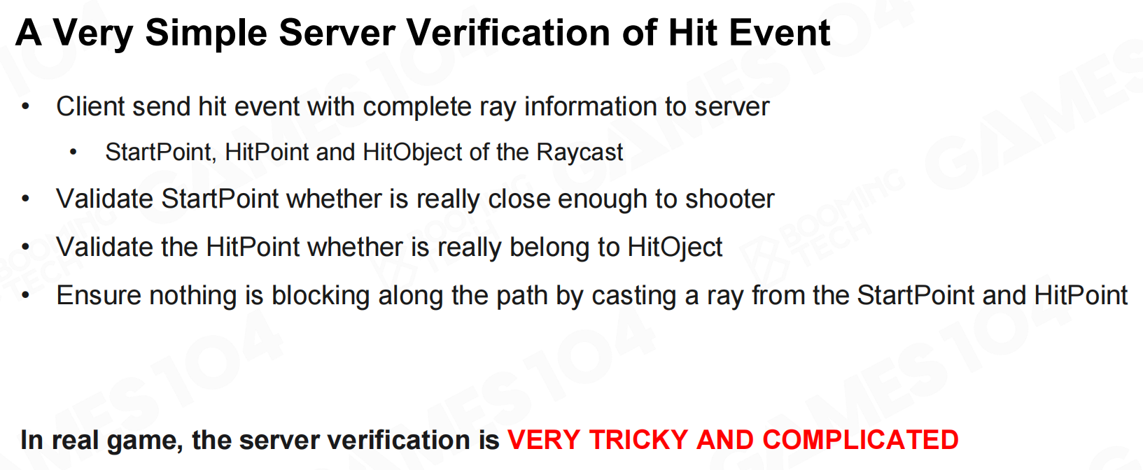 在服务器上会对玩家的行为进行一些验证从而保证确实击中了目标。当然在实际的游戏中这个验证过程是相当复杂的,涉及到大量的验证和反作弊检测。