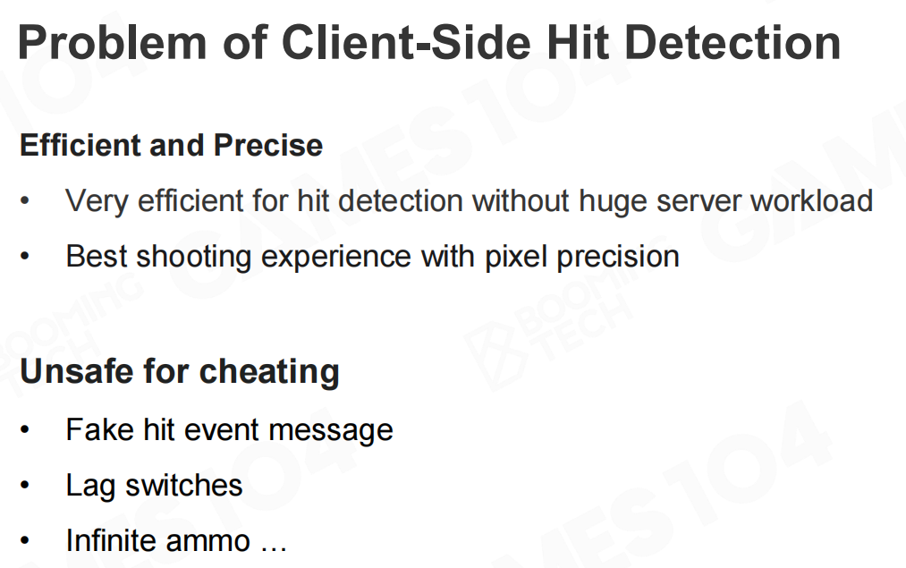 在客户端上进行命中检测的优势在于它非常高效而且可以减轻服务器的负担,但它的核心问题在于它不够安全,一旦客户端被破解或是网络消息被劫持就需要非常复杂的反作弊系统来维持游戏平衡。