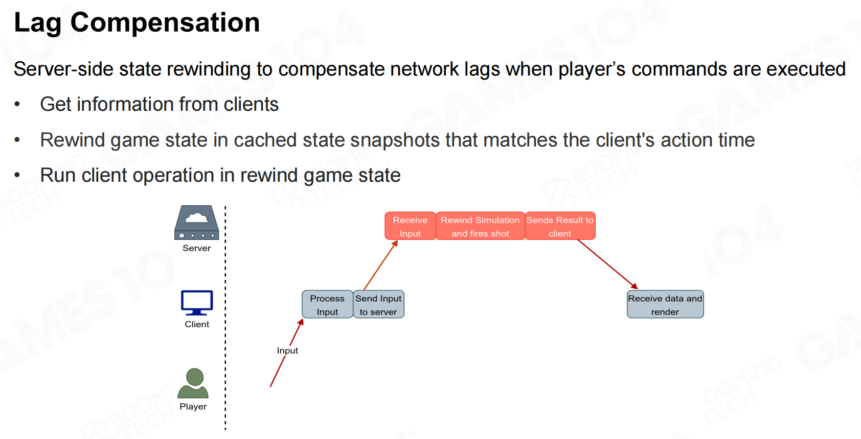 因此我们需要对网络延迟进行一定的补偿。当服务器收到射击的消息时不会直接使用当前的游戏状态,而是根据延迟使用之前保存的游戏状态。