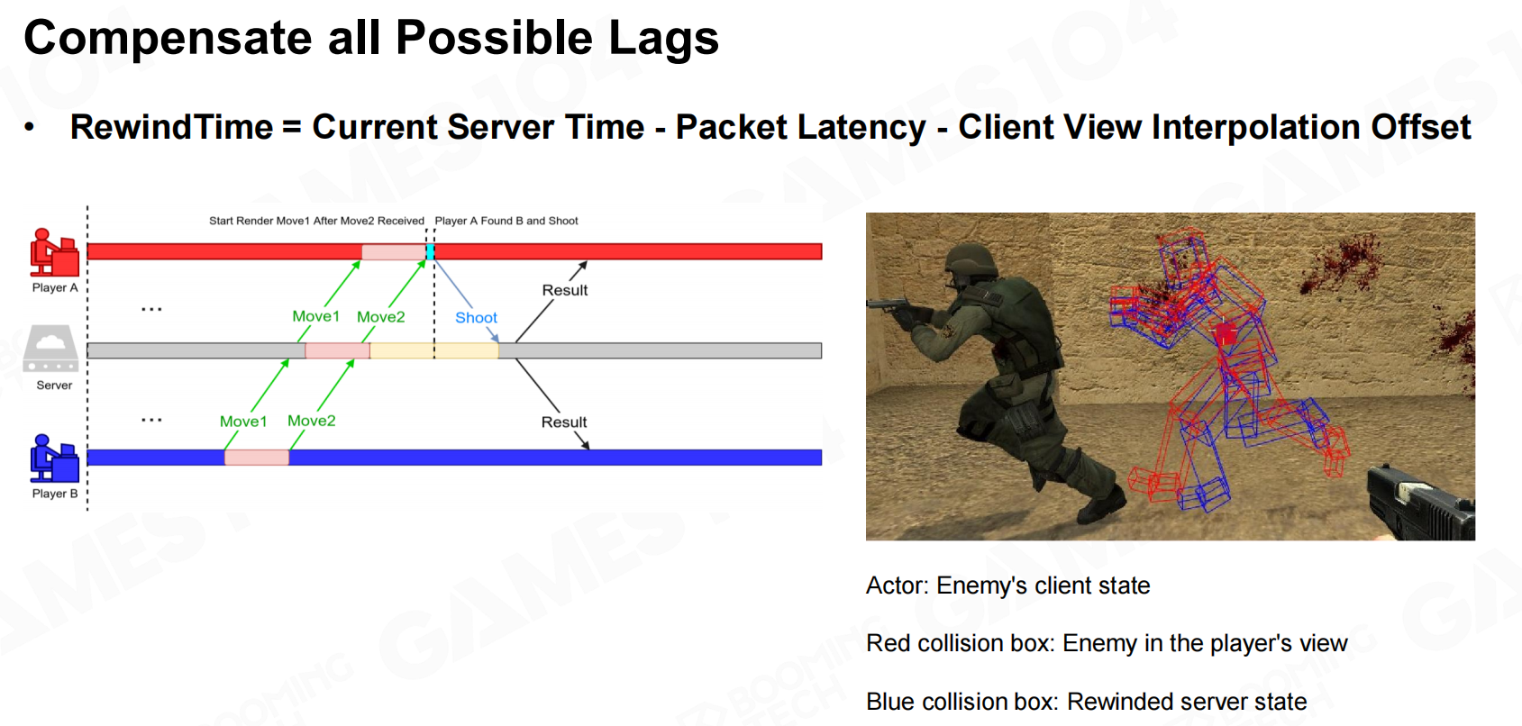在服务器端进行检测的一个难点在于服务器上角色的位置和状态是领先于玩家视角的,当玩家开枪时目标很可能已经移动到其它的位置上了。从这样的角度来看,玩家很难命中移动中的目标。