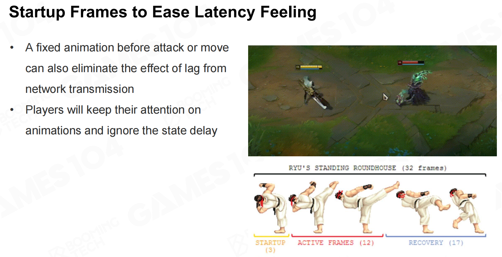 为了缓解延迟的问题在游戏设计时还可以利用动作前摇(startup frames)来掩盖掉网络同步。
