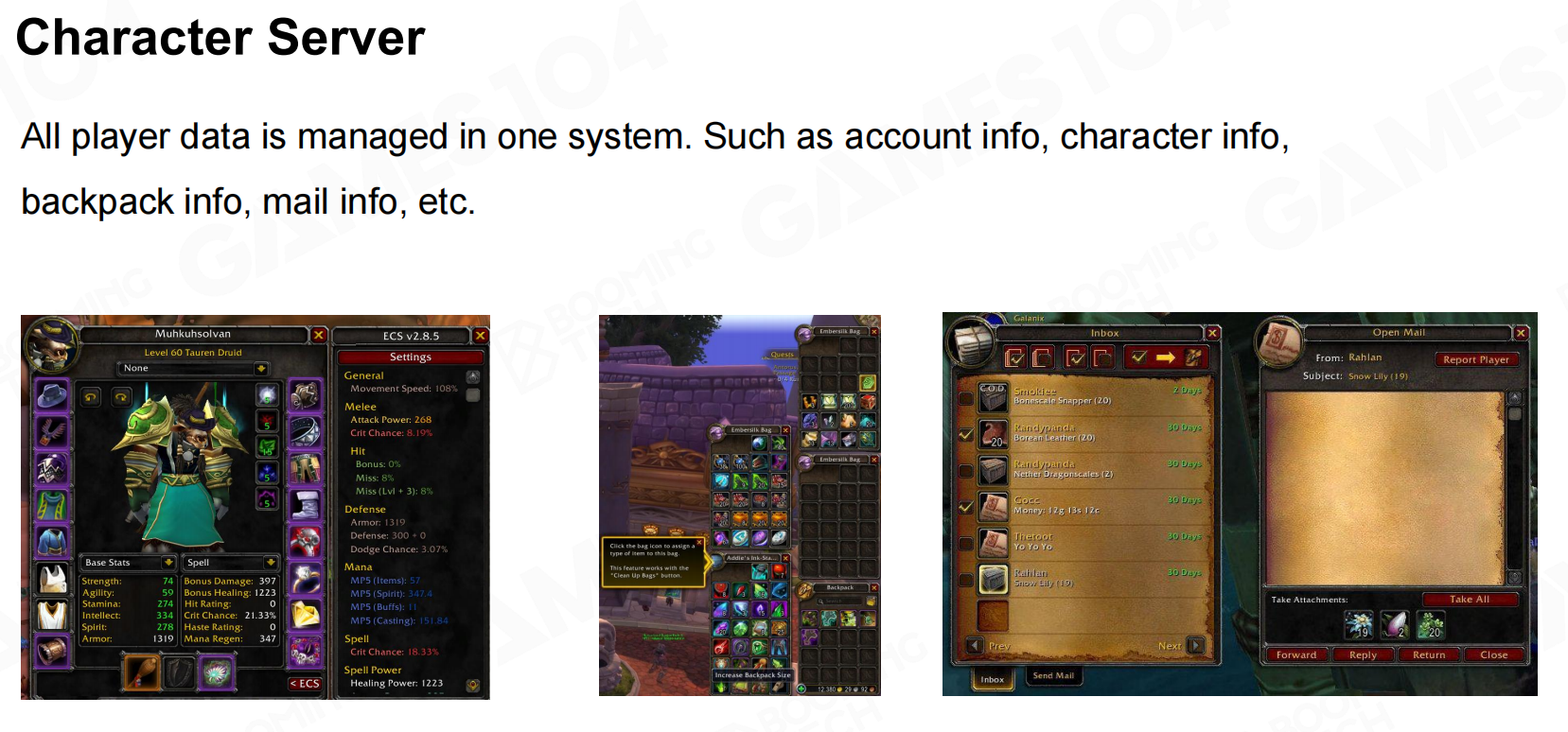 由于MMO中玩家的数据往往非常巨大,玩家的数据一般会保存在一个专门的服务器上称为character server。