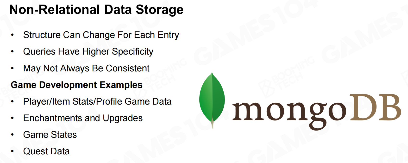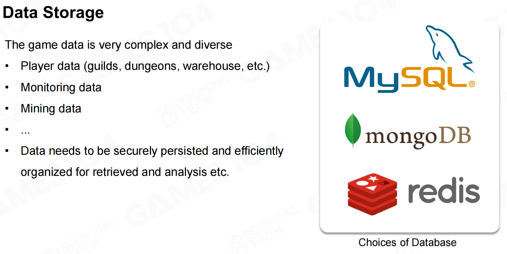 除了关系数据库外,非关系数据库也是目前非常流行的数据存储方法。像游戏中的日志还有各种game state就比较适合使用非关系数据库。