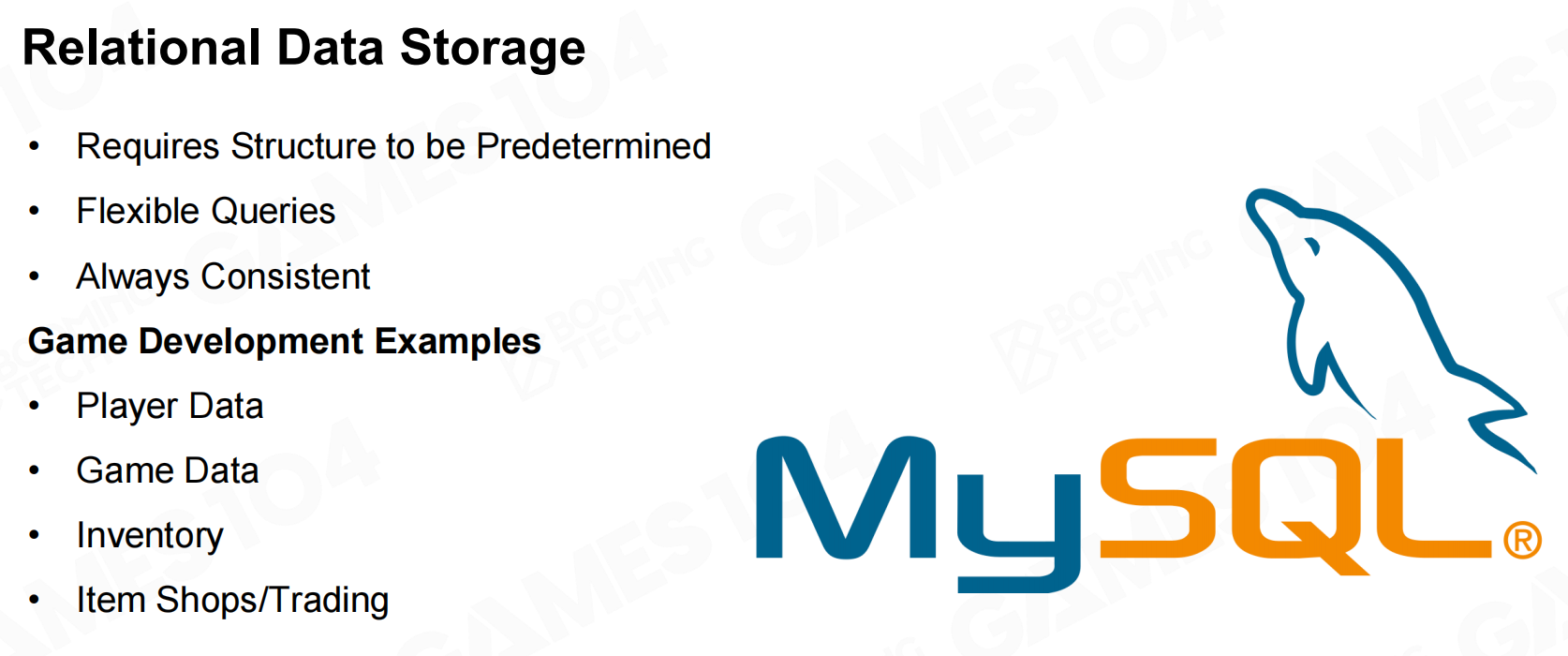 关系数据库是最基本的数据存储方式,像游戏中玩家数据和游戏数据都会使用关系数据库进行存储。现代网络游戏中往往还会结合分布式的技术进行存储。