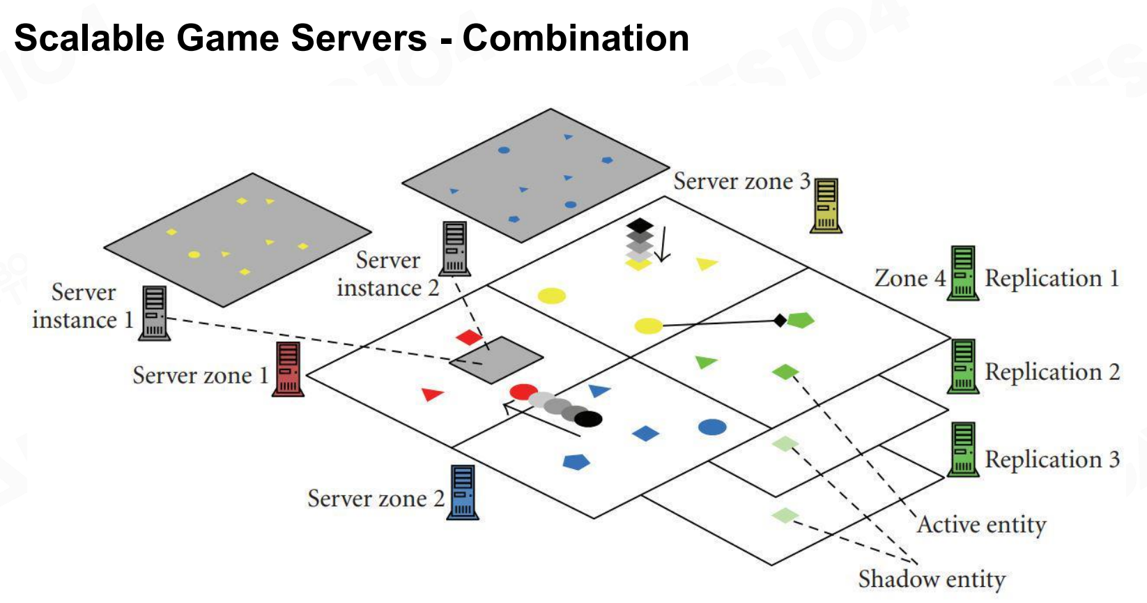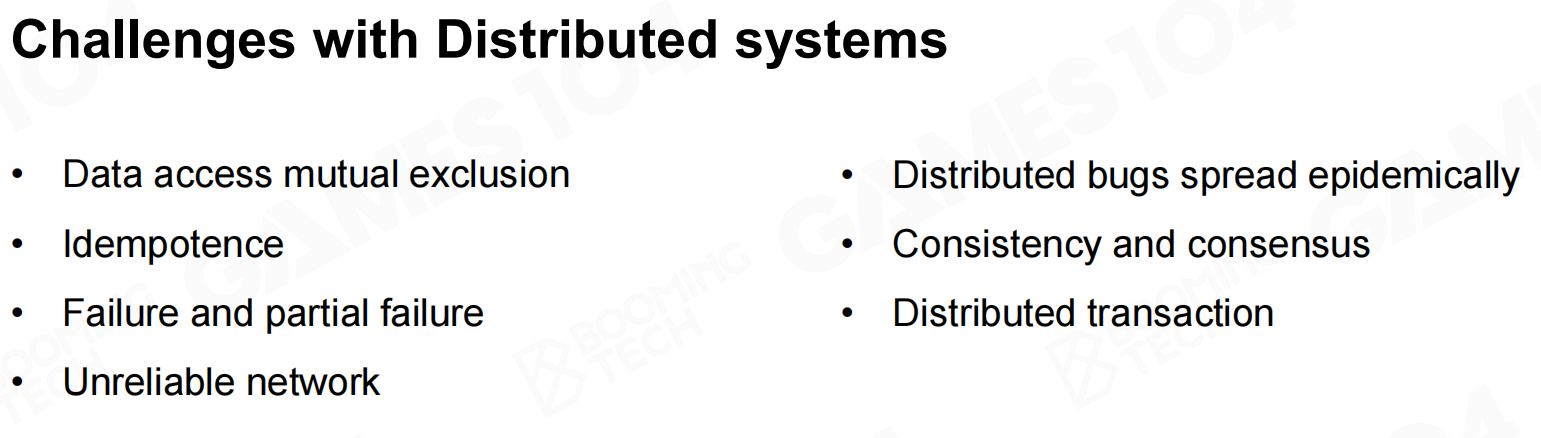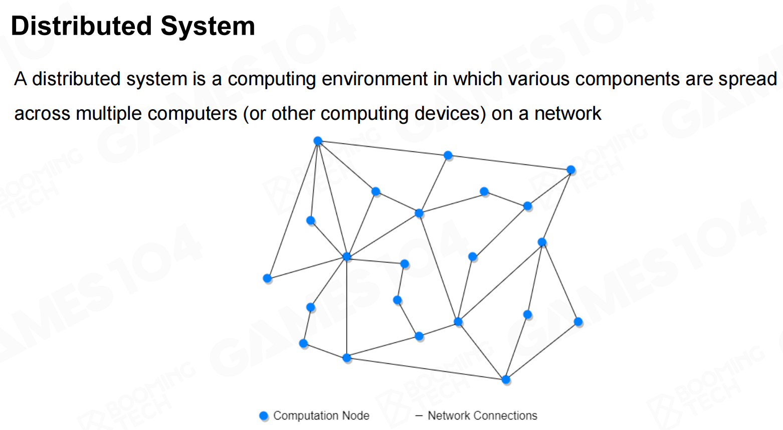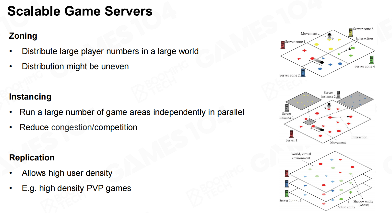 随着玩家数量的增长,在单个服务器上支撑所有玩家进行游玩是几乎不可能的。在这种情况下就需要使用分布式系统(distributed system)来提供游戏服务。