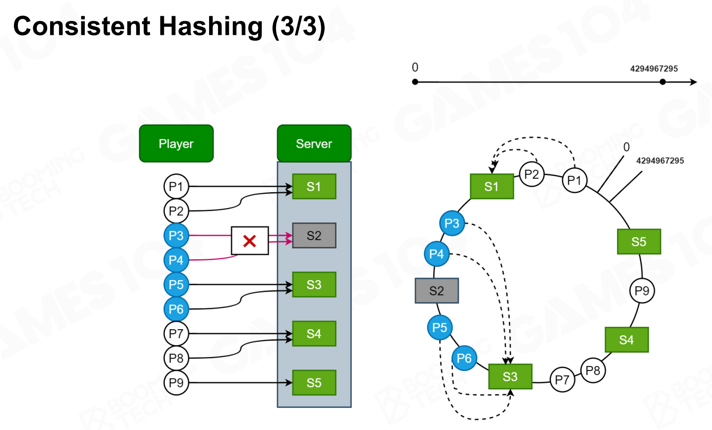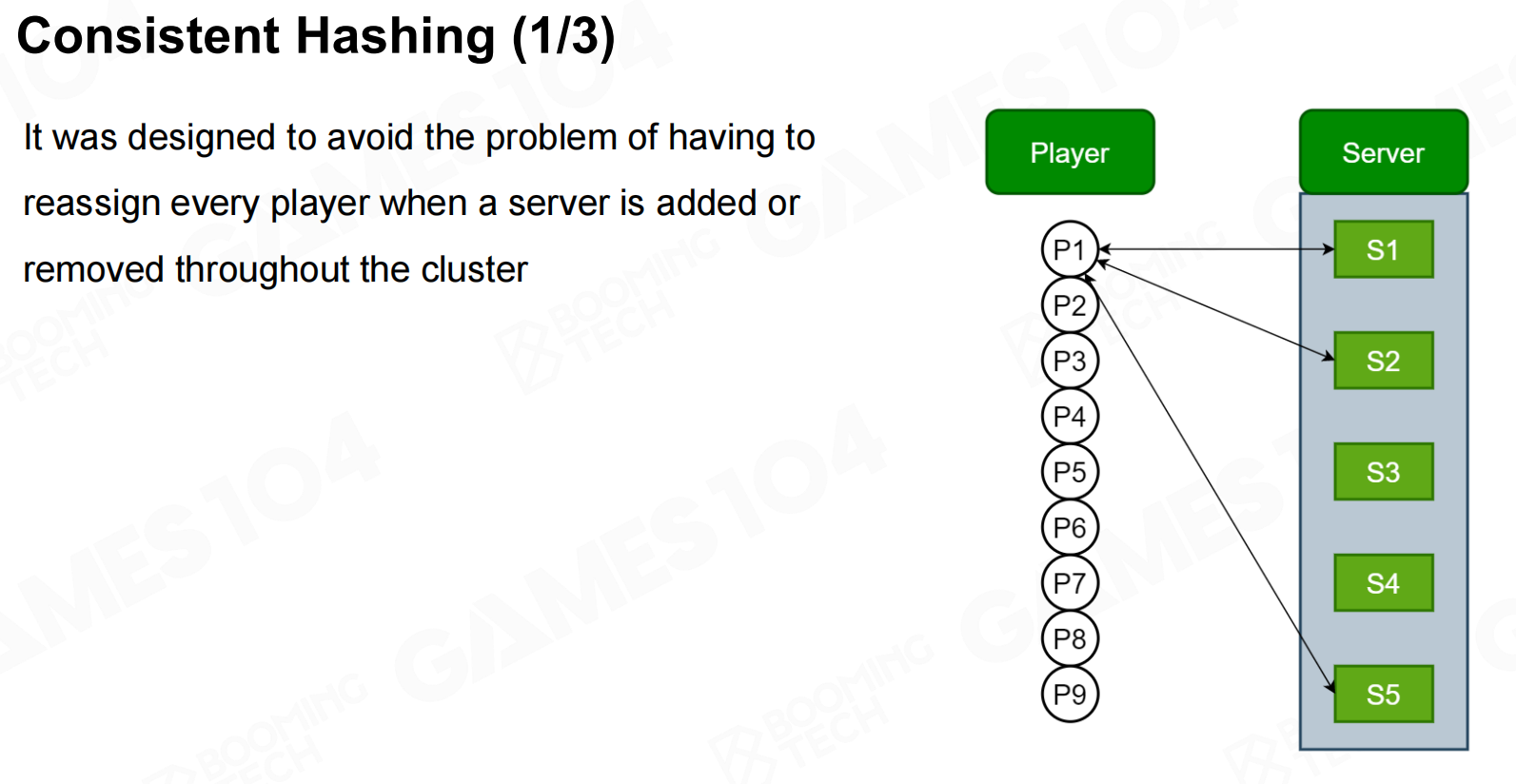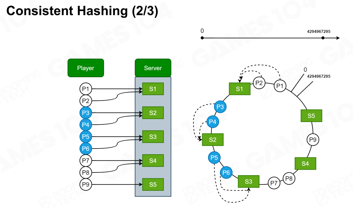 consistent hashing是实现负载均衡的经典技术。它的核心在于为服务器以及玩家设计对应的hashing算法,然后把服务器和玩家映射到一个环上,当玩家需要连接服务器时只需要利用hashing值寻找最近的服务器即可。当某个服务器从圆环上删除时只需要把玩家连接到下一个服务器上即可,类似地添加新的服务器只需要在圆环上添加新的节点。
