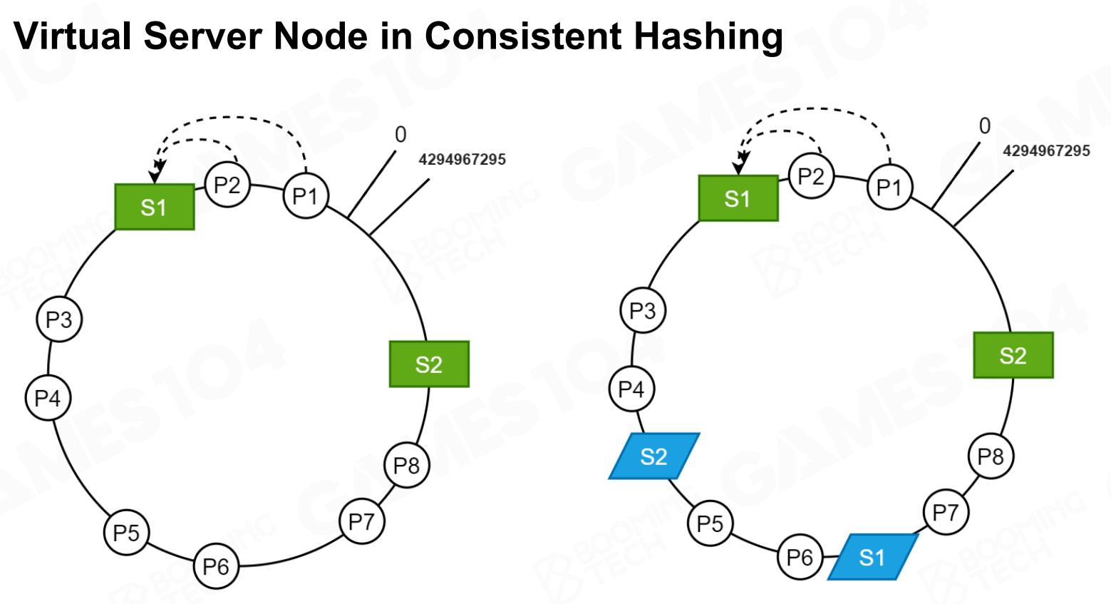 显然consistent hashing算法的效果很大程度上依赖于hashing函数,当服务器或是玩家在环上的分布不够均匀时是很难保证负载均衡的。为了缓解这样的问题我们可以在环上设置一些虚拟的服务器,然后再把虚拟服务器链接到真实服务器上。