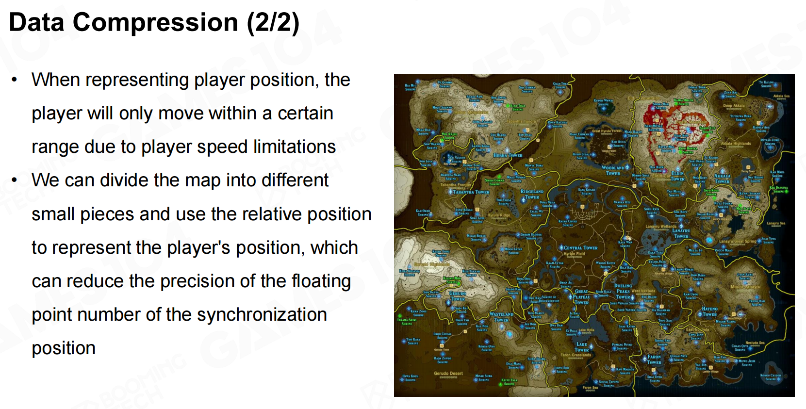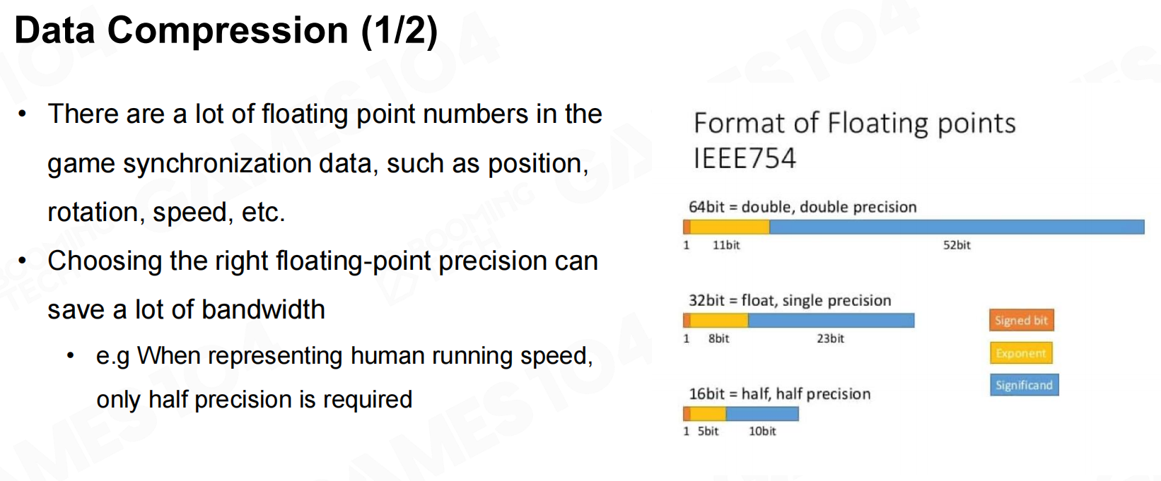 数据压缩(data compression)是经典的带宽优化方法。在网络游戏中我们可以把浮点数转换为低精度的定点数来减少数据量。