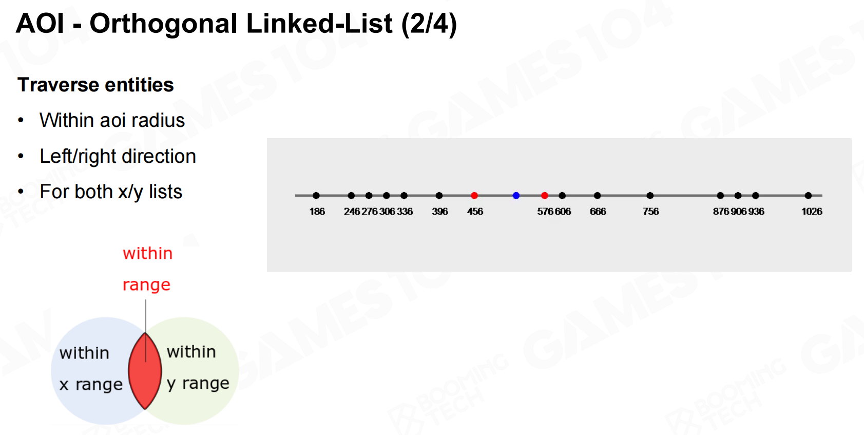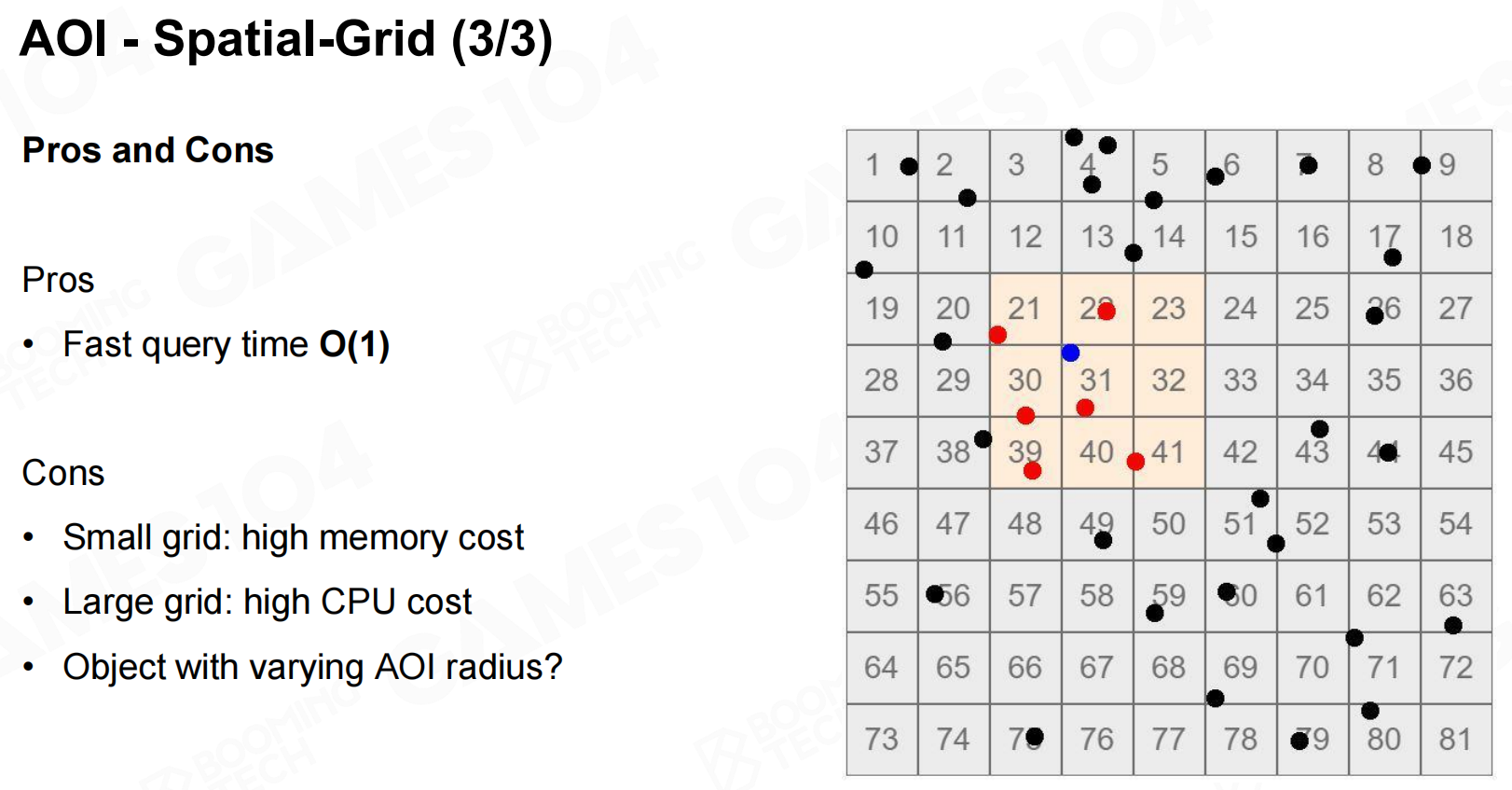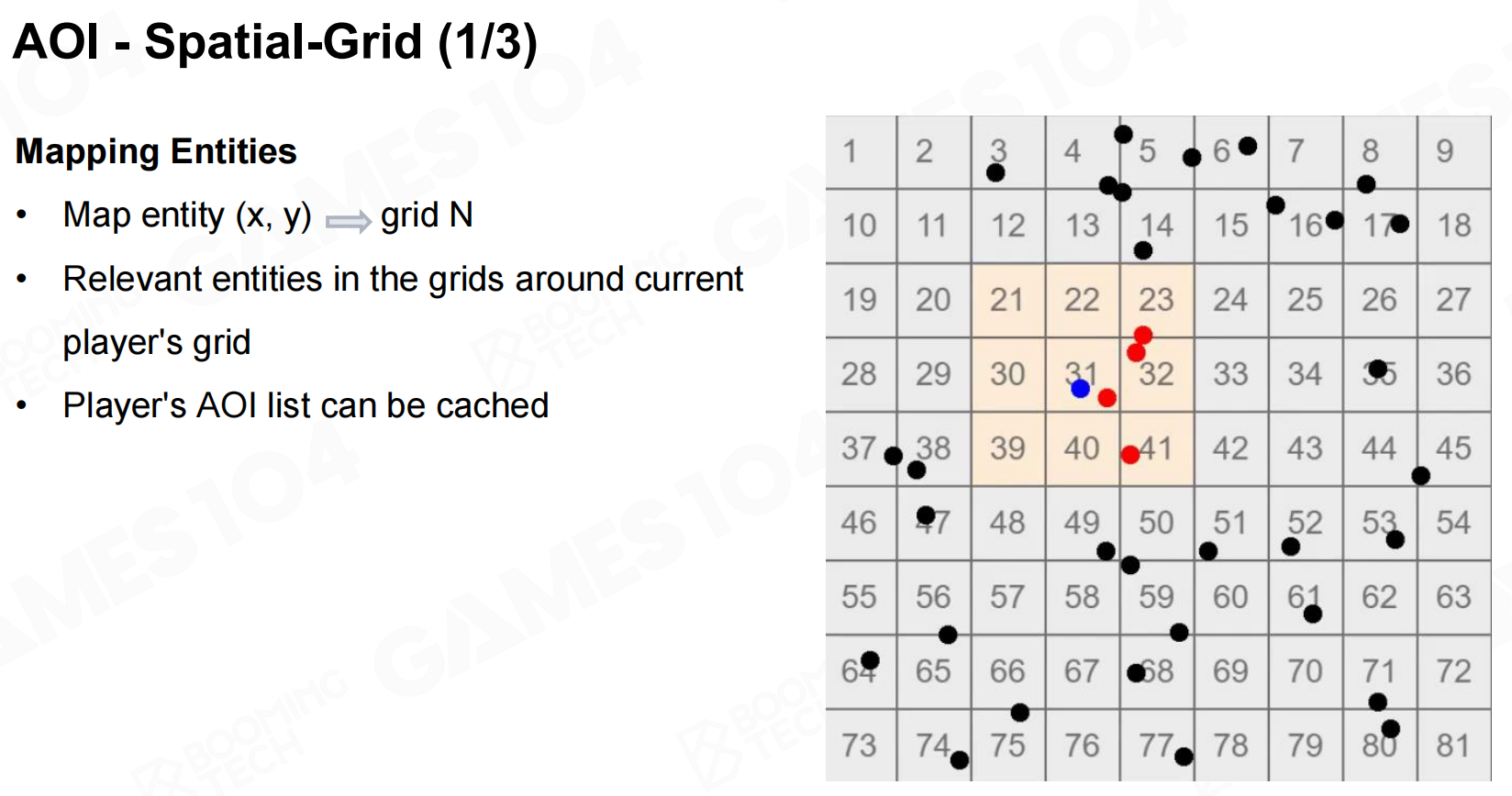 在一些开放世界游戏中我们不希望出现区域的划分,此时则可以利用area of inerest (AOI)的概念。AOI的意义在于我们只需要关注玩家附近的情况而无需考虑更远区域的信息。