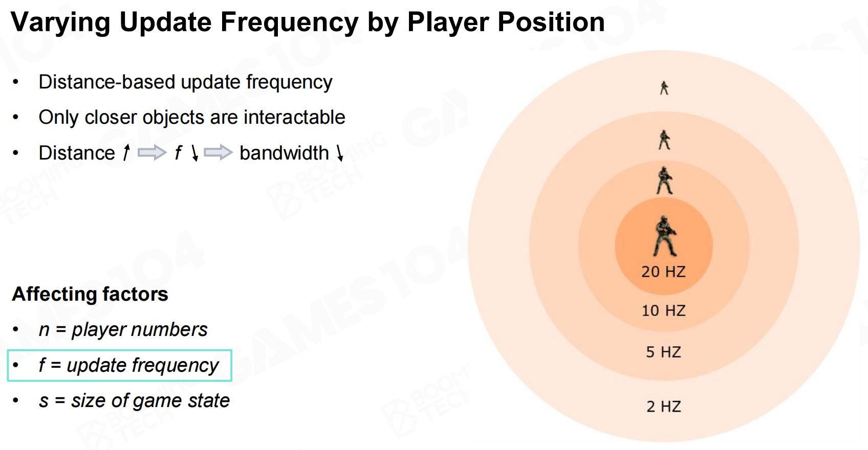 除了上面介绍的方法我们也可以通过调整更新频率的方式来降低带宽。一种经典的策略是根据物体和玩家之间的距离来设置更新频率,使得距离玩家远的物体更新得慢一些,距离近的更新得快一些。